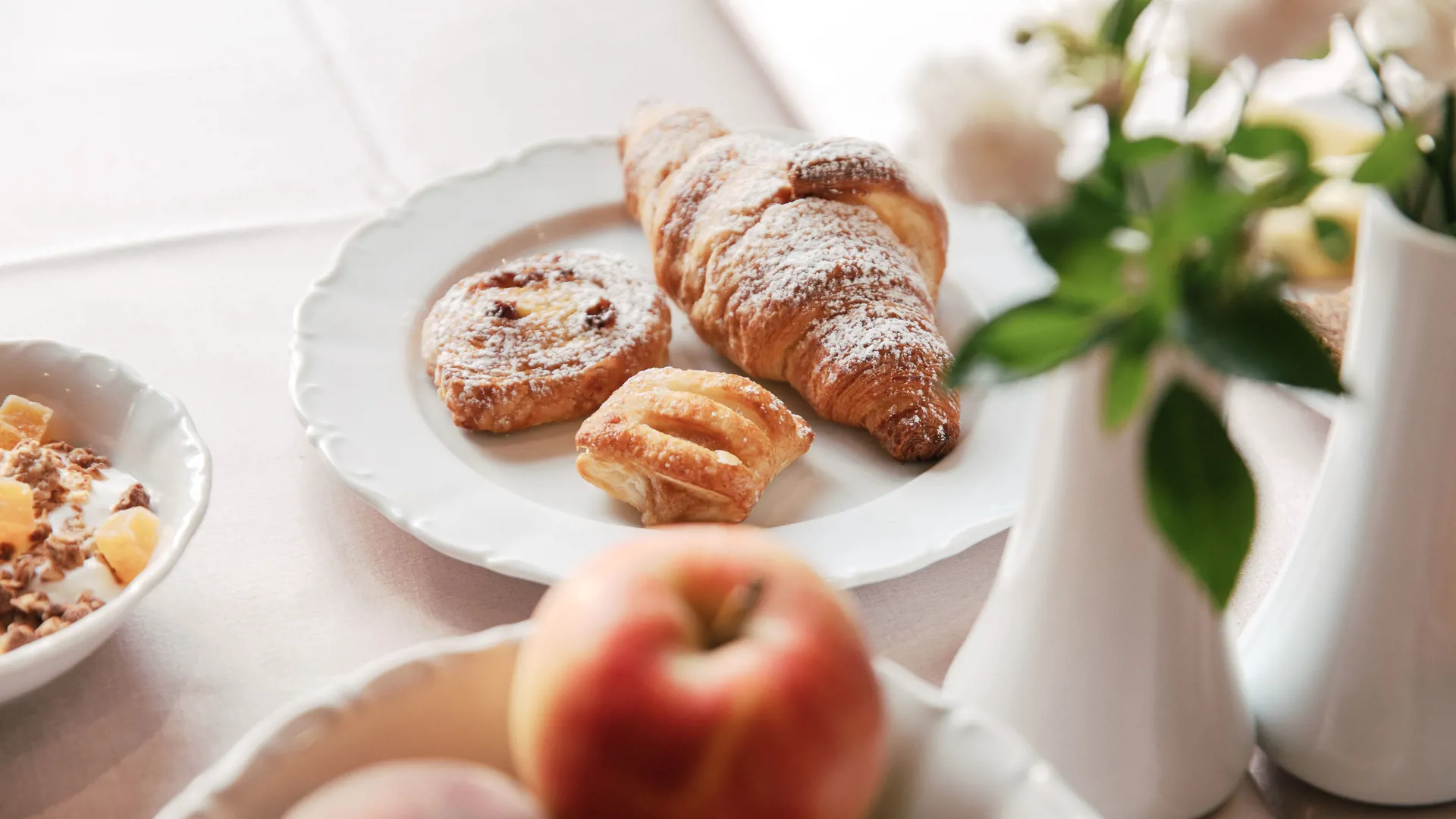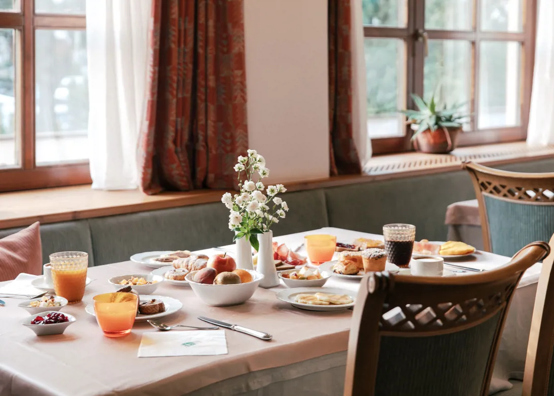 Frühstücksbuffet mit süßen und herzhaften Speisen, Nachmittagssnack und Abendessen mit 4 Menüs zur Auswahl