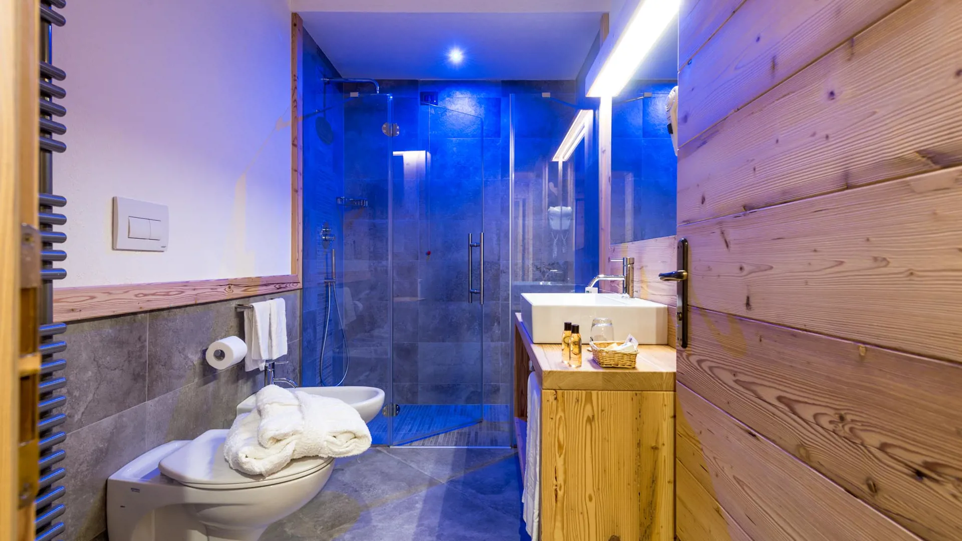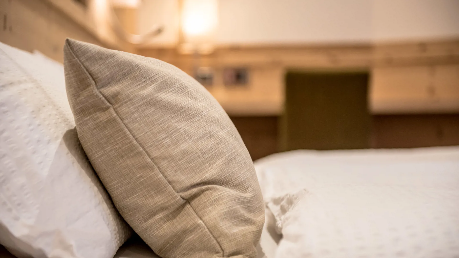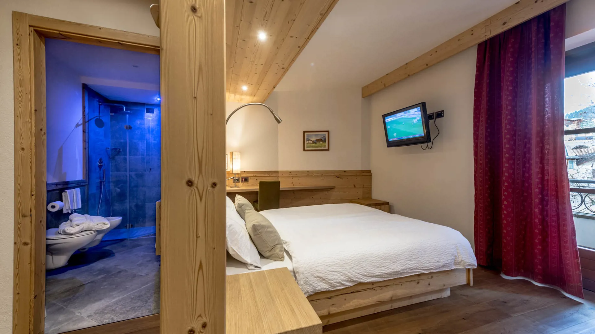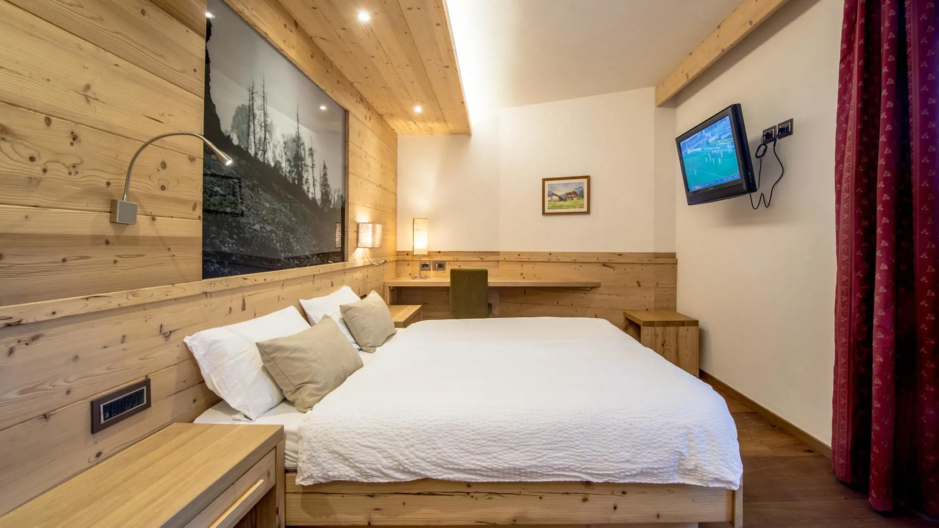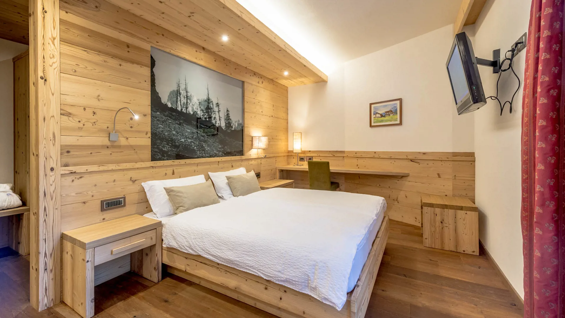 Juniorsuite mit Verkleidung aus Tannenholz.